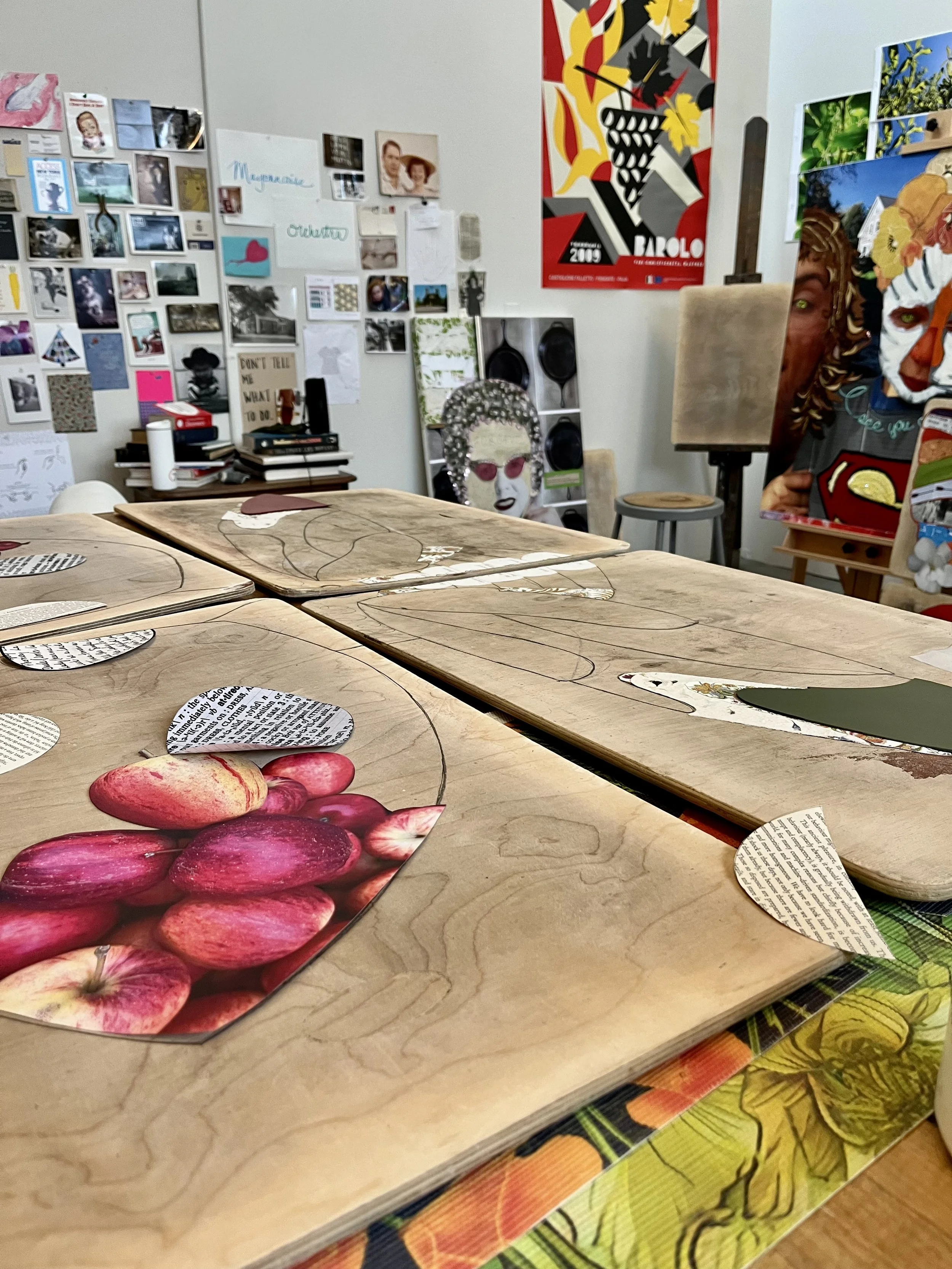 mixed media collage + paint inspired by nostalgia and created with a mashup of irreverence, humor, original art and artifact.