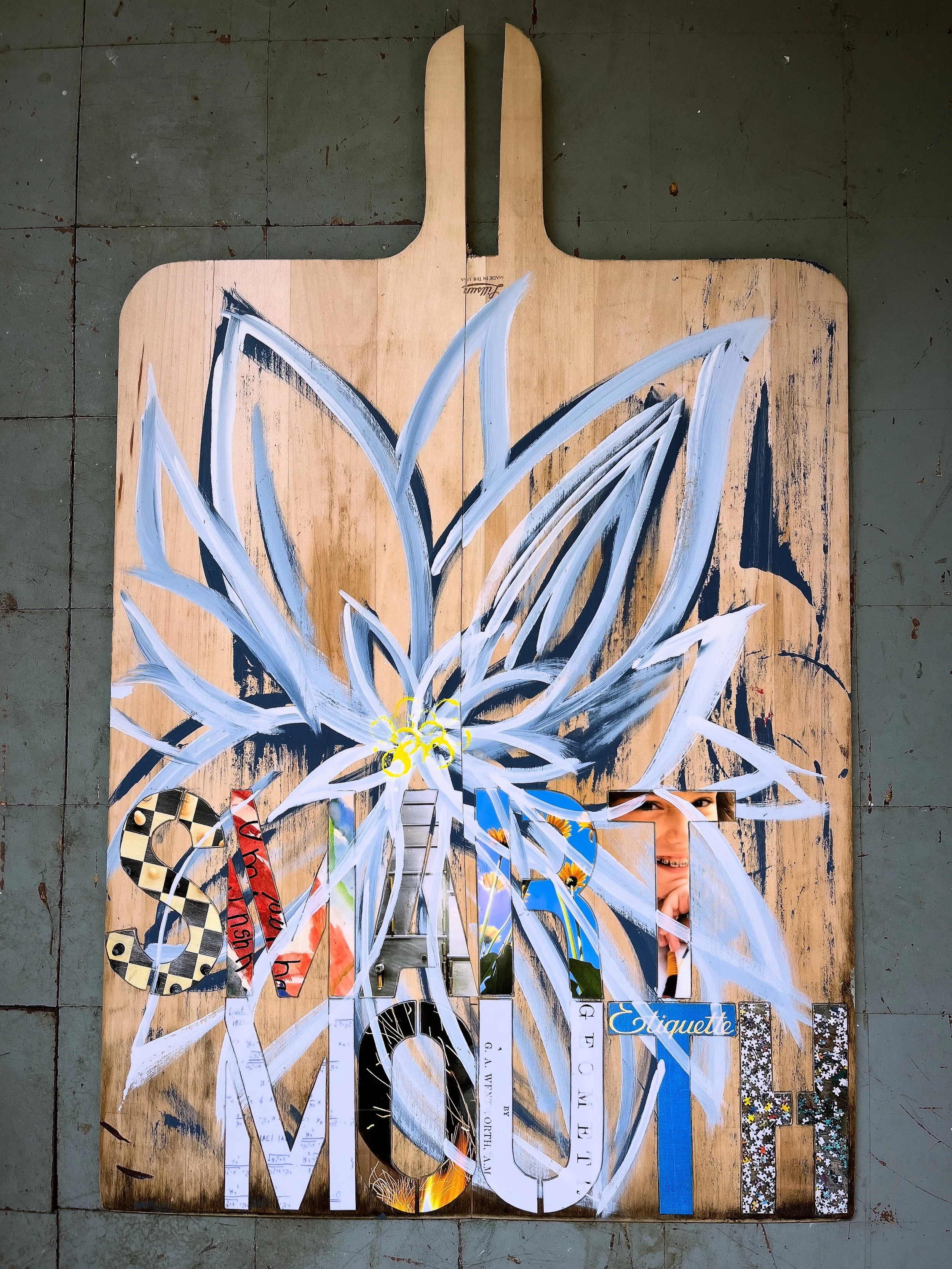 recycled mixed media collage + paint inspired by irreverence, humor, original art and artifact that’s colorful + accessible